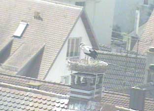 Nachdem das Nistmaterial auf dem Dornerhaus von den Rathausstörchen geklaut war, schritt die Ende Februar zurückgekehrte Störchin vom vergangenen Jahr mit ihrem Partner unverdrossen zur Tat und beide fädelten, bar jeder Unterlage, auf dem Kamin ein neues Nest aus Reisigteilen und Altgras zusammen - manches war aus dem Rathausnest zurückgeklaut worden. Der Ring am Bein des Männchens weist ihn als einen in Illmensee 2005 geschlüpften Oberschwaben aus. Auf dem Rathausnest in Riedlingen brüten die "Riedlinger Fernsehstars" ebenfalls seit dem 10. April. Die "Oldies" sind jetzt schon seit 18 Jahren Sommer wie Winter in Riedlingen zu Hause.